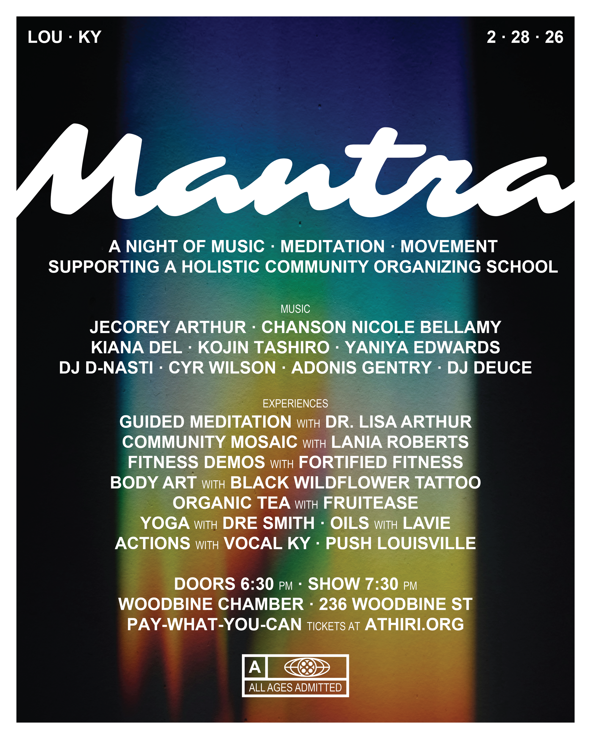 TICKETS SUPPORT ATHIRI | PAY-WHAT-YOU-CAN MANTRA: A NIGHT OF MUSIC, MEDITATION, & MOVEMENT GENERAL FUND Custom Amount Please enter an amount $ Would you be willing to cover processing fees? No worries if not. 3% Cover the Fee Donate Donate This donation is for tickets to our fundraising event MANTRA, happening on Saturday, February 28, 2026 in Louisville, KY. If you would like to donate but cannot attend, please select our GENERAL FUND at the top of this donation form. Custom Amount Please enter an amount $ One-Time Donation